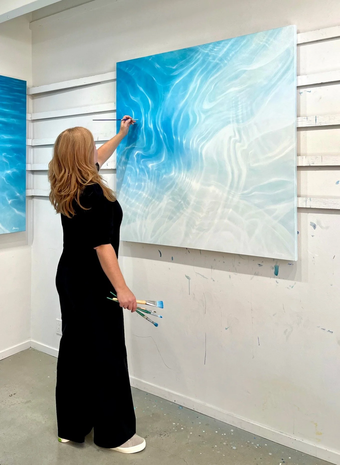 Here, the focus tightens; the scene becomes almost abstract. The water’s shifting lines are distilled into soft, rhythmic currents of blue and white, hovering between realism and minimalism. The result is a meditation on stillness, movement, and the spaces in between.